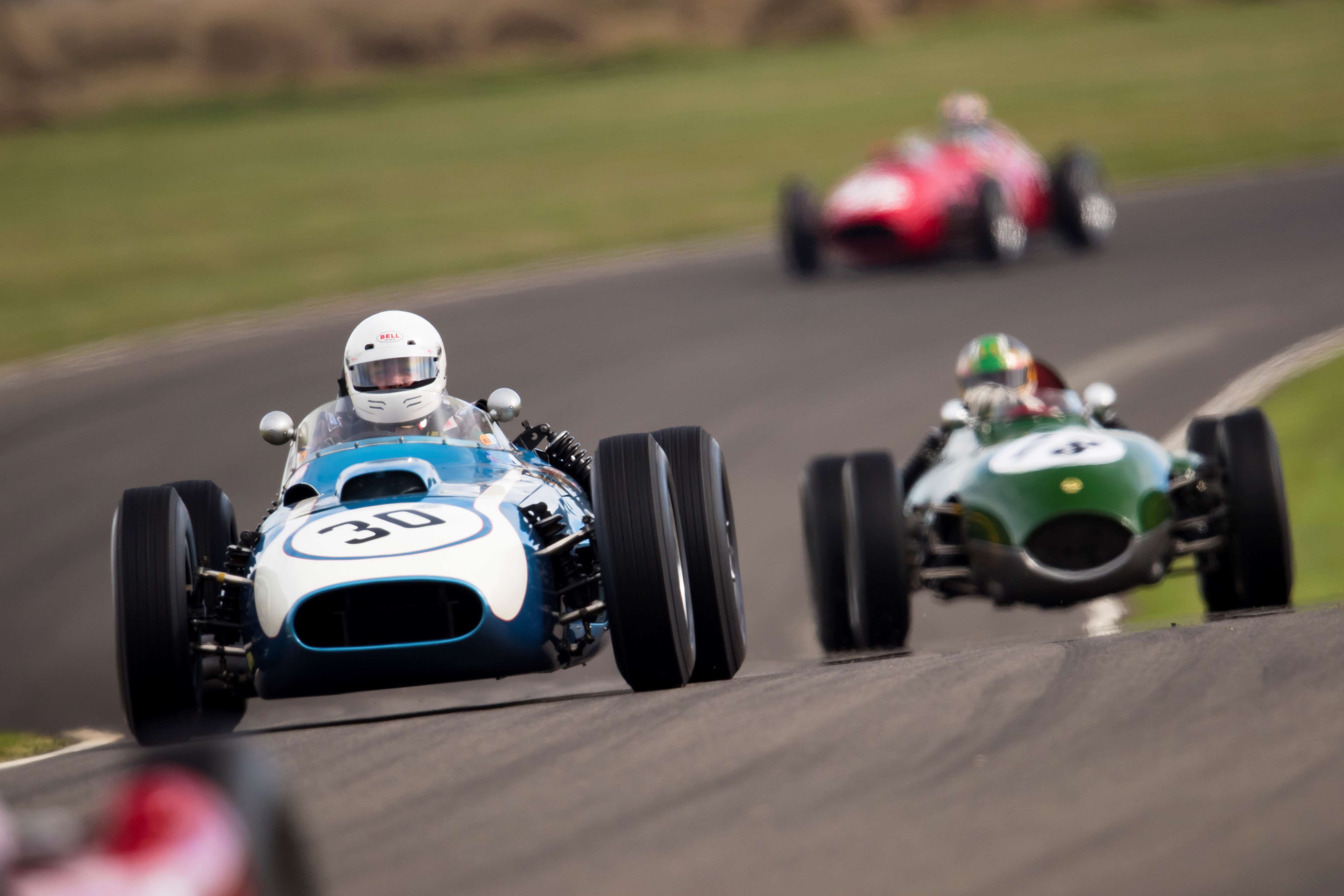 Julian Bronson claimed honours in a dramatic Richmond Trophy race for 2.5-litre Grand Prix cars. The veteran charger proved blisteringly quick in his beautiful Scarab, but it was Tony Wood who appeared set for victory in his unique Tec-Mec Maserati until a late spill cost him dearly. The pole-sitter recovered from a slow start which saw him drop to fifth place on the run to the first corner, only to climb up to third by the end of the opening lap. Bronson held on to the lead until quarter-distance in the 20-minute race, before Wood moved pass third-place man Rob Hall and the leader.