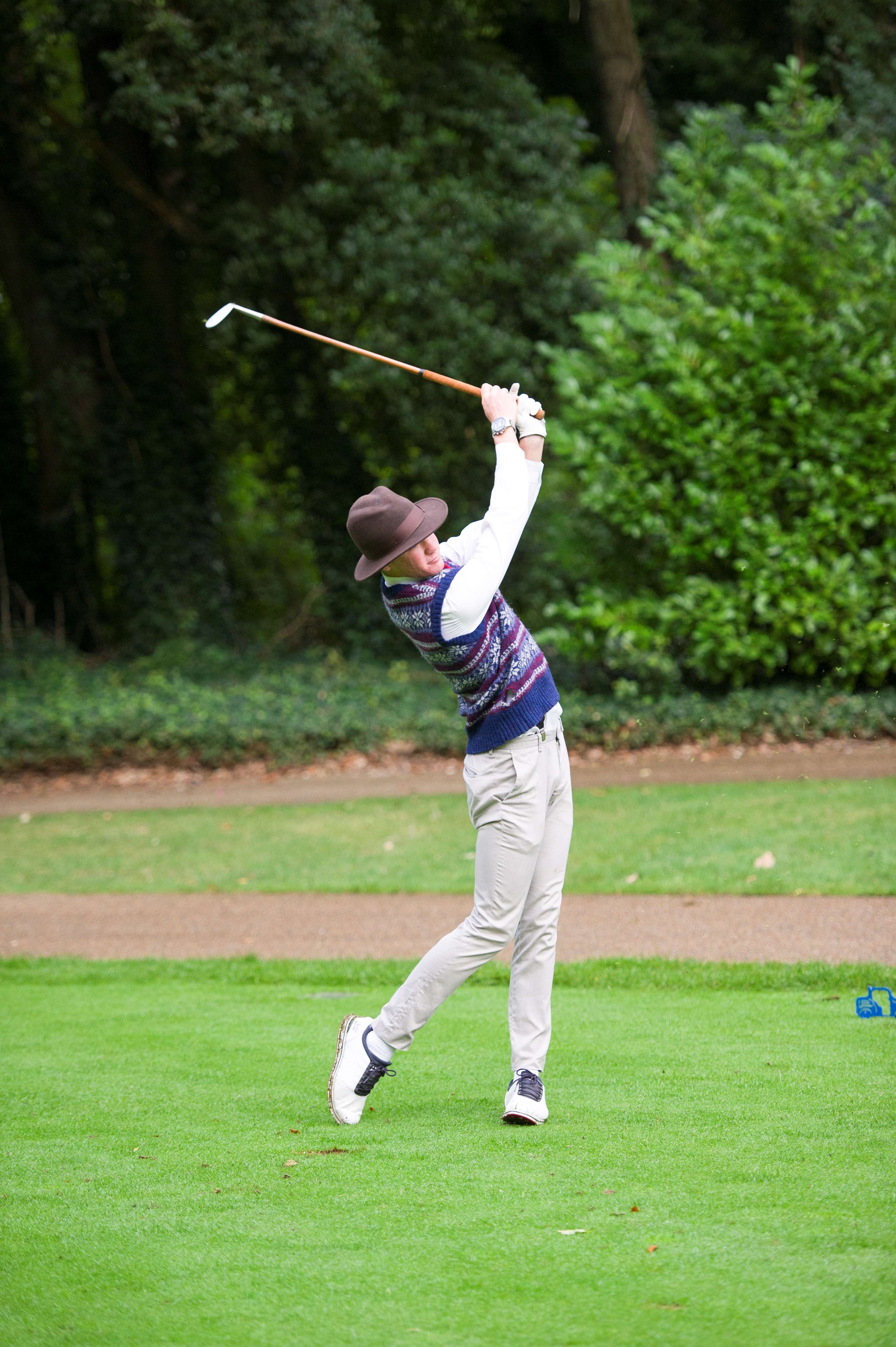 Now in its ninth year, the Revival Golf Challenge began in calm but overcast conditions, with the game being a Stableford format. Each player used a full set of Hickory shafted clubs, lent for the occasion by Tony Hunt’s South of England Hickory Golf and comprising mashies, jiggers, brassies, spoons and niblicks. Such was the level of effort made by the players to dress in period clothing – with no shortage of plus fours, flat caps, classic ties and tweed jackets – it was decided that an individual winner of the best dressed competition could not be chosen.